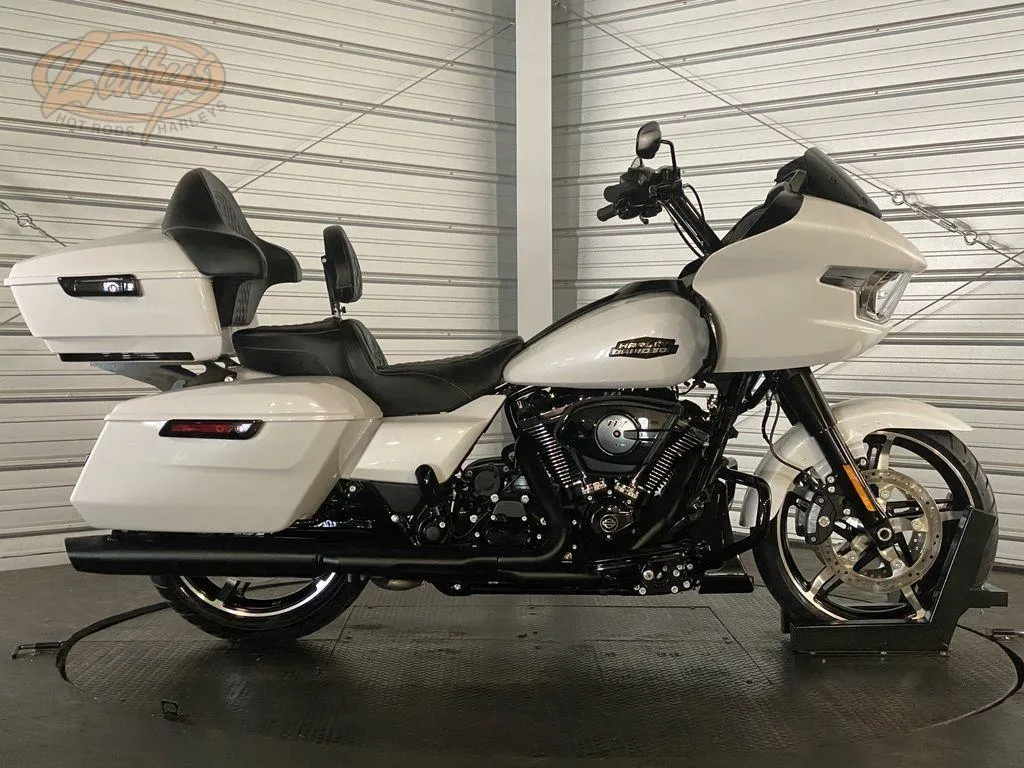 GENERAL: 2025 Harley-Davidson FLTRX - Road Glide, Available. ENGINE: Milwaukee-Eight engine producing 105 horsepower. TRANSMISSION: 6-speed transmission. DRIVETRAIN: Belt final drive. MILEAGE: 16 miles. FUEL TYPE: Gasoline. COLOR: White Onyx Pearl w/ Black Finish. DIMENSIONS: Width 37.2 inches. NOTES: This motorcycle is part of the Grand American Touring family and is in near-new condition.