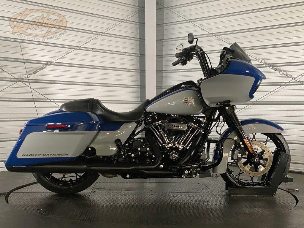 GENERAL: 2023 Harley-Davidson FLTRXS - Road Glide Special, Available. ENGINE: Milwaukee‑Eight engine. TRANSMISSION: 6-speed transmission. DRIVETRAIN: Belt final drive. MILEAGE: 872 miles. FUEL TYPE: Gasoline. COLOR: Bright Billiard Blue/ Billiard Gray w/ Black Finish. NOTES: Performance‑oriented touring model with distinctive shark‑nose fairing and striking color scheme.
